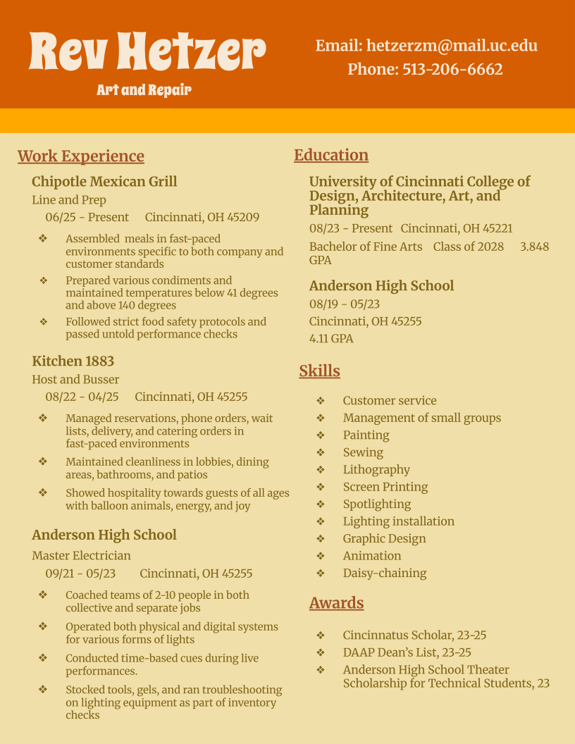 I'm Rev Hetzer, a jack-of-all-trades physical artist; name it, I've probably tried it! From painting to sculpture, printmaking, and welding, I love any hands-on art experience. Within my art experience, I've led small groups, entertained children, and prioritized hospitality toward my teammates. I'm currently in my third year of my BFA at UC DAAP. I am looking to sharpen my physical and leadership skills in co-ops.